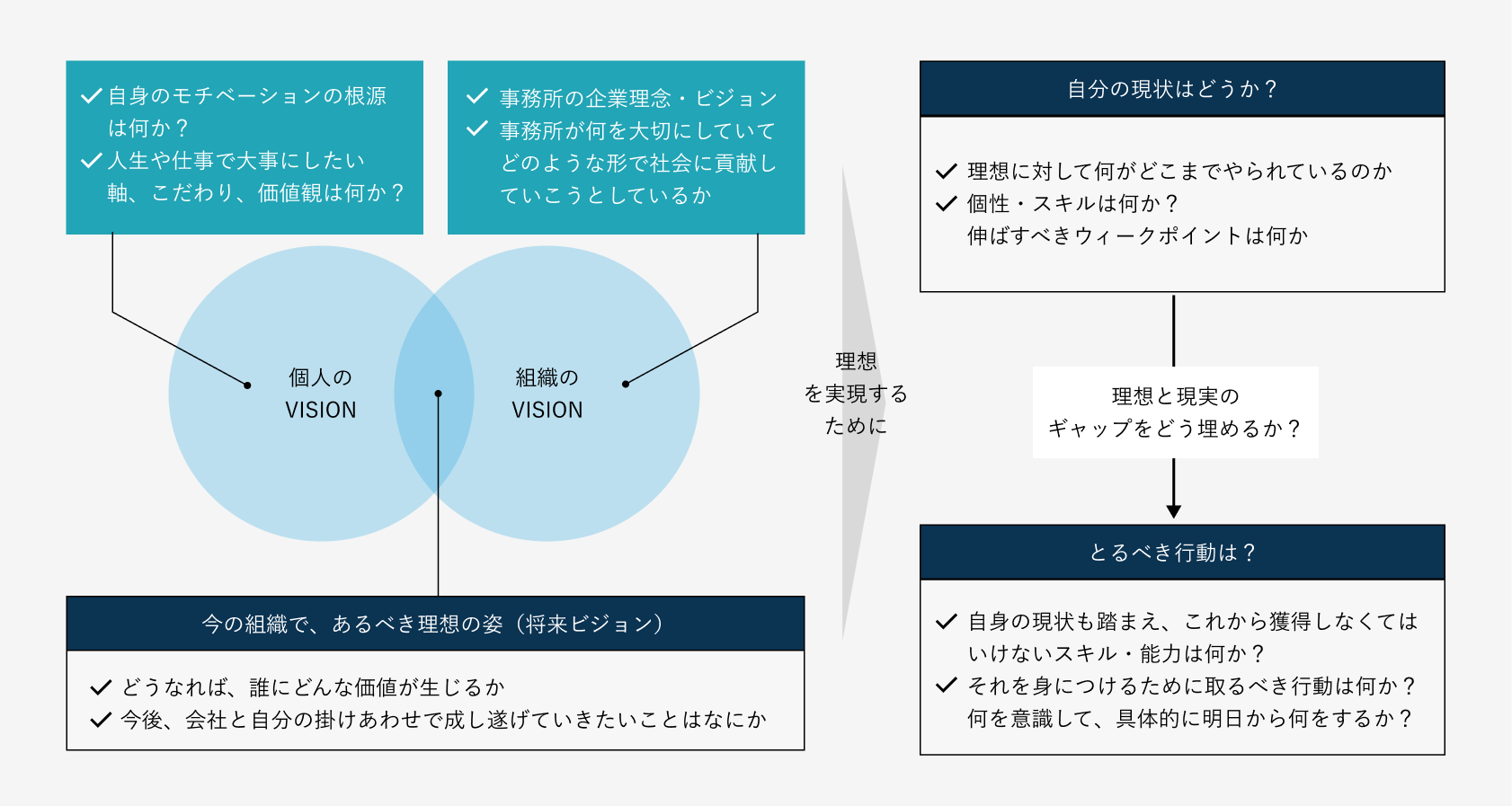 私たちは、メンバー一人ひとりが主体的にキャリアを築いていける環境づくりに力を入れています。そのために大切にしているのが、「個人のありたい姿」と「事務所の目指す姿」との重なりを見つけることです。まず、メンバー自身が自分のモチベーションの源や、大切にしている価値観・キャリアの軸を内省し、代表との面談で自己実現ができているかを把握します。一方で、私たちの事務所が大切にしている理念や、社会に提供している価値についても、メンバー全員で改めて言語化し、共通認識を深めています。